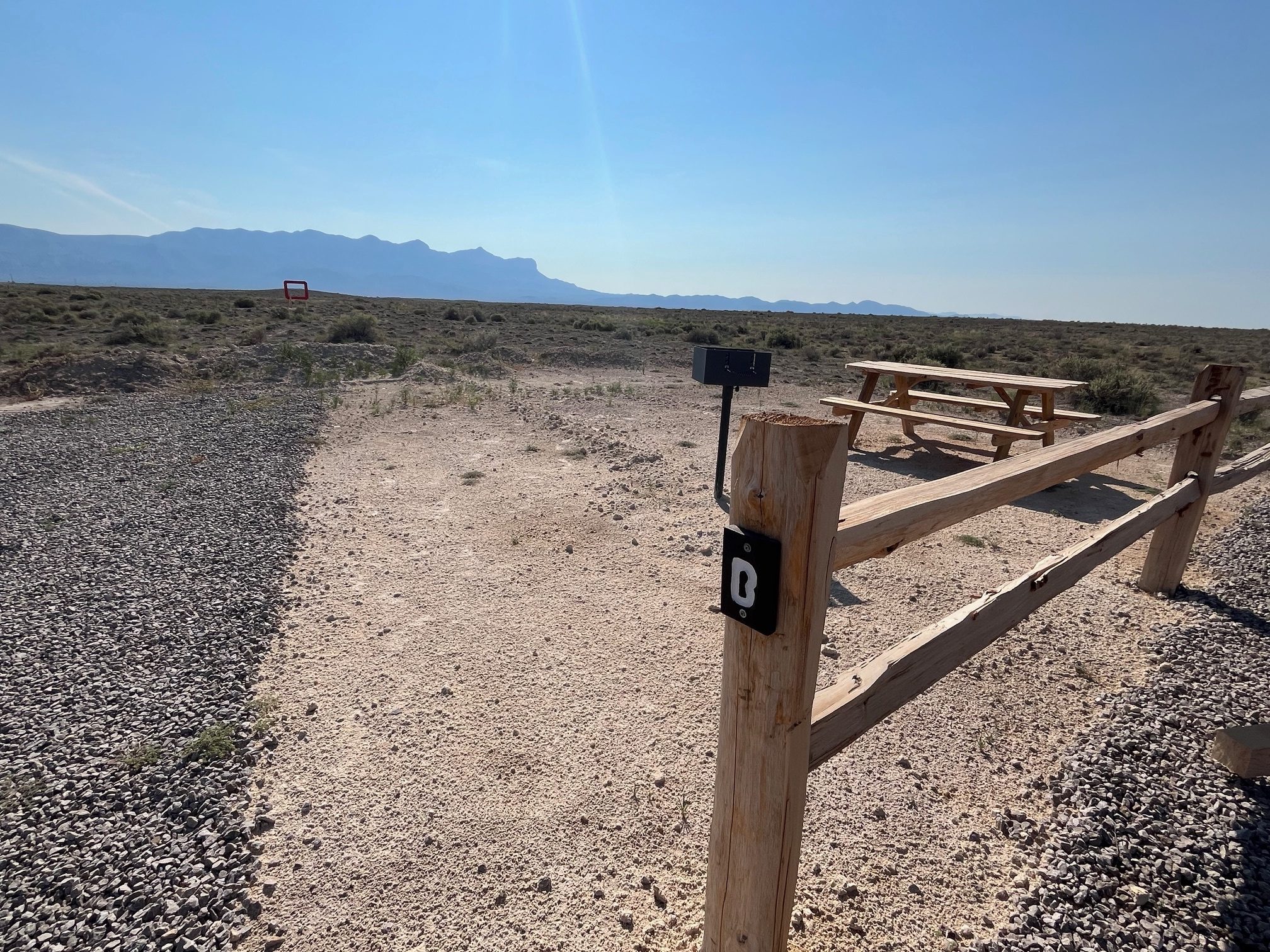 Campsite B has a direct view of the Guadalupe mountain range is located about 60 feet from the porta-potty and trash site making it a convenient site for campers. The parking pad is large enough for most Class B RVs and campers. There are no hook-ups at the site. The site does have a charcoal grill (bring your own charcoal and fluid) and picnic table. It is located about 1/10th of a mile from the lodge which hosts the camp shower and Wifi. Please note that we are located in a remote desert wilderness area on the western side of the park.