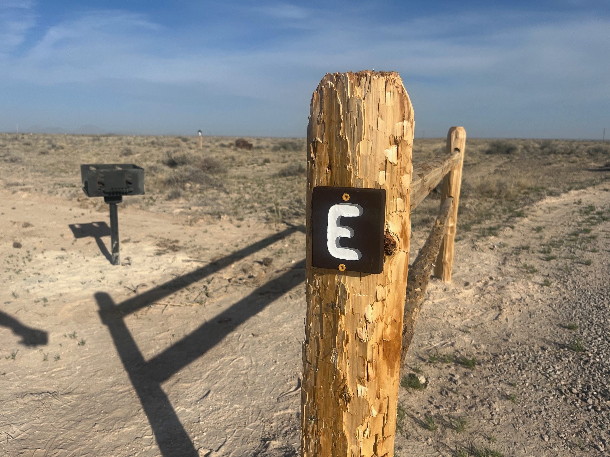Campsite E has a direct view of the Guadalupe mountain range and is located near porta-potty and trashcans making it a convenient site for campers. The parking pad is large enough for most Class B RVs and tent campers. There are no hook-ups at the site. The site does have a charcoal grill (bring your own charcoal and fluid or we sell at the trading post) and picnic table. It is located about 1/10th of a mile from the lodge which hosts Wifi and the trading post. The Wifi is free to use but be mindful that it is satellite. Please note that we are located in a remote desert wilderness area on the western side of the park.